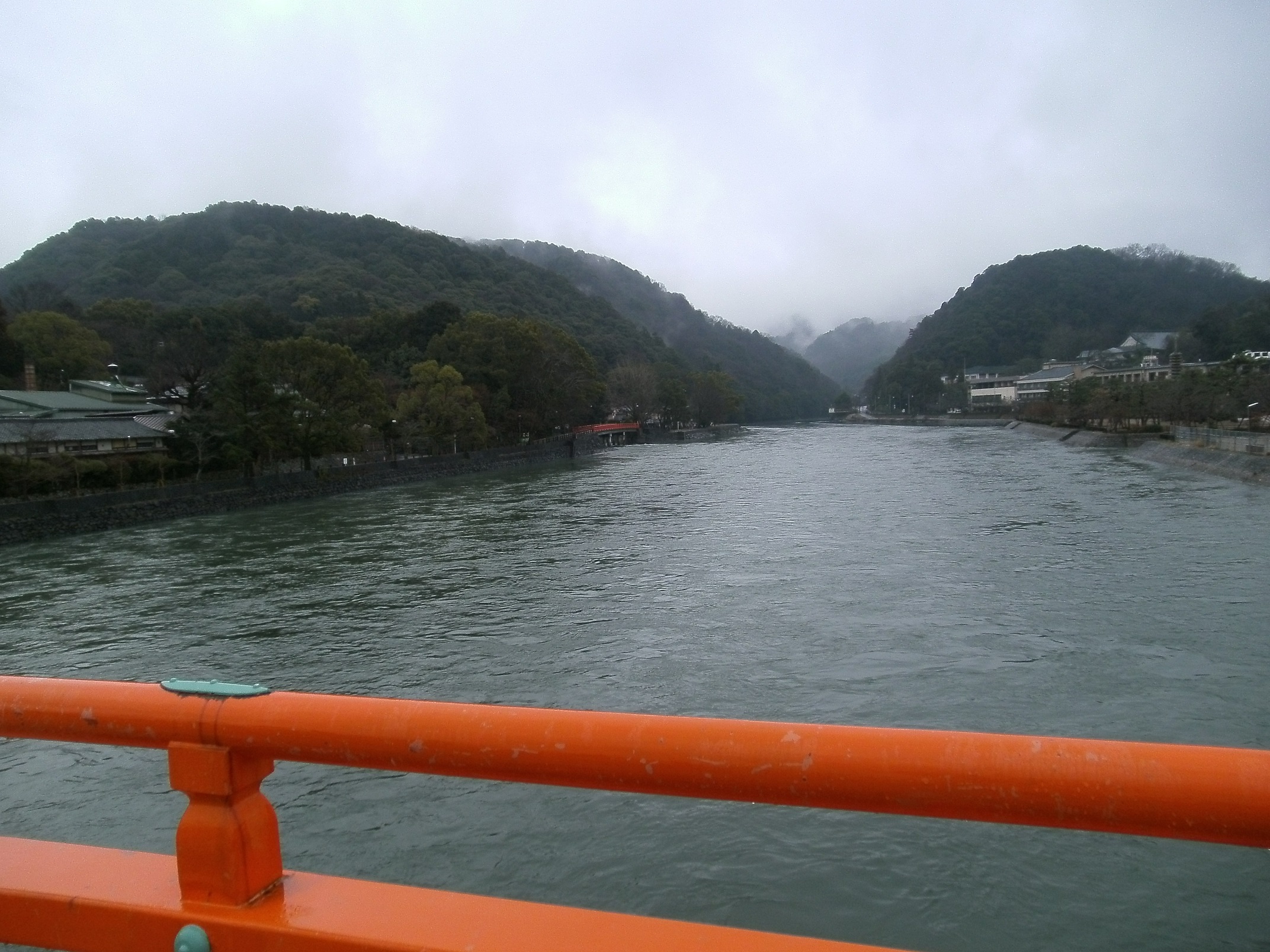 朝霧橋から天ケ瀬ダムのある上流の眺め。雨後の山霧が立ち上る。説明ではこの橋から下流のみを0.4Mくらい深くするというが、今後こうした工事をするのだろう。土は上流から運ばれてきて、一度流れが緩やかになるとそこに堆積してしまうのだ…。