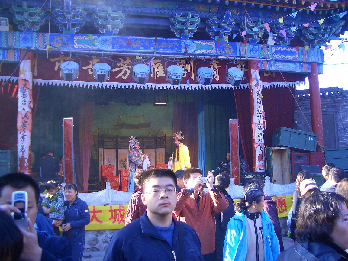 それは規模の大小を問わず、小さい村にはそれなりの舞台が常設され、本当の農民や手工業の労働者が、「余技」として仕事の合間に練習してきた「戯劇」を演じ、神に豊作のお礼をする。それを村中の人が交替で観に来る。従って彼らの演劇は朝早くから夜更けまで続く。私も山西省の御利益のある廟に朝7時にお参りしたら、その小さな廟の前に立派な舞台があり、それぞれが御利益のお礼参りに来た人達の為に、演じている。えんえんと。